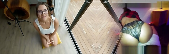 Busty Milf teaches a teen shy chick with glasses to handle her stepdaddy's dick