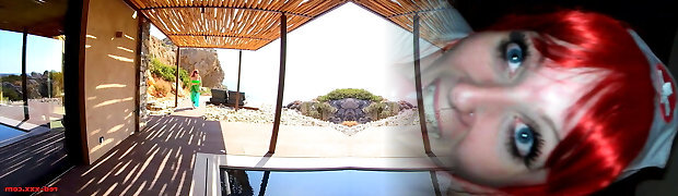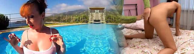 Busty redhead Cougar Red XXX gets off poolside