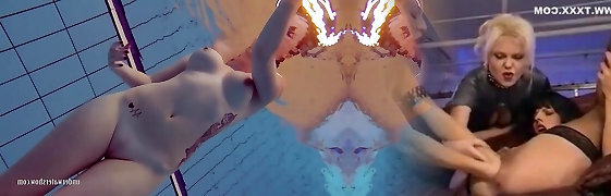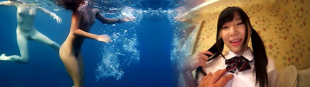 Two beautiful ladies swimming naked in a pool