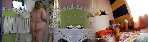 A boyfriend has set up a covert camera in the shower room at home and is peeping at a ginormous gf with a monstrous ass. Amateur fetish.