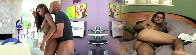 Brown-haired slut with small tits enjoys the big black cock while her husband sees