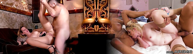 Busty fuckers give boobjob and take turns sucking their boss' massive fat penis