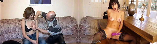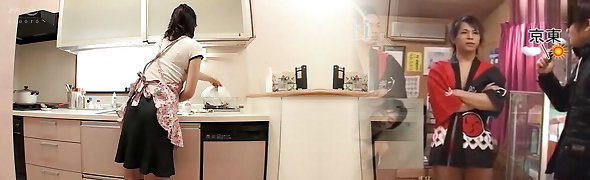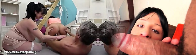 Naked granny in the kitchen fucks her silverware before the baker fucks her arsehole hard through