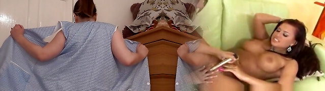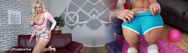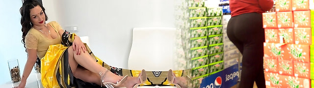 Curvy milf with pierced nipples, Angel Wicky is lying on the sofa and anxiously sucking a huge dildo