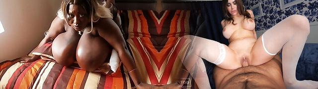 Sultry BBW ebony hoe with big tits gets boned and nutted by milky dick
