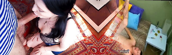 Black hair honey with nice tits on sofa fucking fat lollipop watched by spectacular blonde