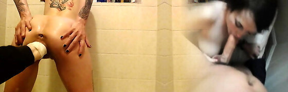 Curvy Sandy-haired MILF In Leather Double-fists Her Hubby And Shoves a Ginormous Sex-toy In His Culo