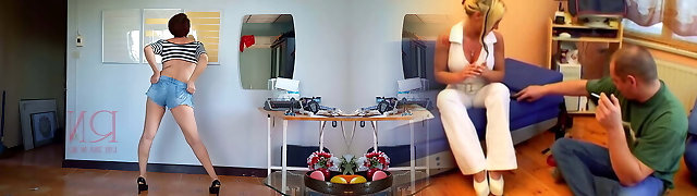 Regina Noir in denim shorts. Home striptease. Housewife shows her coochie. The depraved stepmother undresses. boobs and